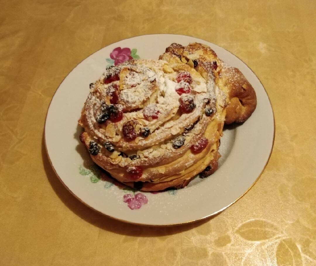 Это кекс или кулич Краффин, кому как нравится. Также можно испечь из этого теста булочки или несколько маленьких куличиков-кексиков. #пасха #выпечка #десерт #детское #кекс #кулич #краффин Ингредиенты: теплого молока, яйца, сливочного масла или маргарина Пышка, сливочного масла для смазки, сахара, соли, сухих дрожжей, муки, изюм, цукаты, растительное масло для смазки блюда Способ приготовления: Смешать теплое молоко, я его подогрела в микроволновке, дрожжи, сахар, соль и яйца. Добавить растопленное сливочное масло. Добавить частями муку. Замесить тесто. Оставить тесто в смазанной растительным маслом посуде на расстойку в теплом месте примерно на час. Через час или меньше, как пойдёт, тесто вынуть и обмять. Сразу говорю, что у меня коврик для теста уже успел обгореть в духовке, поэтому не пугайтесь особо! 😯 Раскатываем из теста пласт толщиной 3-4 мм. Далее промазываем его растопленным сливочным маслом. Сверху выкладываем цукаты и изюм. У меня был изюм и вишня, изюм я предварительно замо