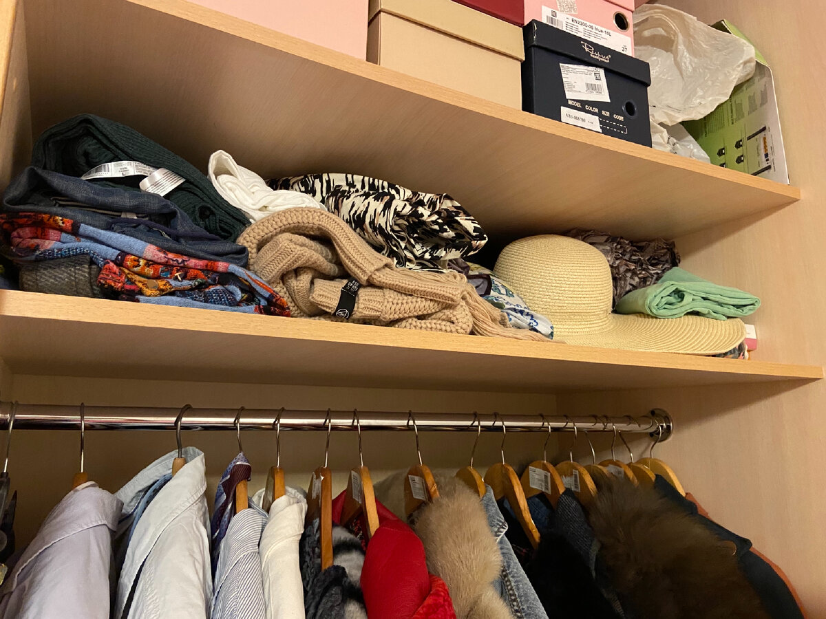 К магазину Икея я всегда относилась очень положительно. Я никогда не скупала там тонны свечек, посуды и разного ненужного барахла, типа ножика для вырезания сердцевины из ананаса. Но кстати вспениватель для молока, который валяется без дела у меня есть))) В Икея я покупала только полезные вещи. У меня есть несколько комплектов постельного белья, которые случат мне уже много лет. Мебель, кровать, матрас, зеркало. И вот перед самым закрытием этого магазина, когда ещё было все хорошо, я все таки решила организовать хранение одежды на одной из своих полок в шкафу, в которой царил всегда полный хаос. Вот так выглядела моя полка до организации: В основном я там хранила сезонные платья. Например зимой у меня там лежали летние вещи, а летом наоборот. Шляпы там тоже хранились всегда, потому что я их брала с собой только в отпуск. Доставать оттуда было крайне неудобно, приходилось буквально выкапывать вещь оттуда. Я купила коробку "Стук" которая максимально подходила под размеры моей полки. И во
