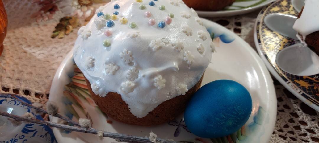 Доработала,с опытом,рецепт кулича,который пекла с 2004 года. Моим близким и мне очень нравится. Ингредиенты: муки, прессованных дрожжей, чл соли, молока, мягкого сливочного масла, ст сахара(26-28ст л), ст л меда, ст л сметаны домашней, творога, оливкового масла, крупных яиц +3 желтка, чл ванили, чл корицы, чл куркумы, изюма+50г клюквы, Глазурь, белка, чл лимонного сока, ст сахара(перебиваю его в кофемолке), Для посыпки-готовые изделия Способ приготовления: Оживляю дрожжи,добавляю половину подогретого молока по 3 ст л муки и сахара. Когда дрожжи поднимутся,замешиваю опару,добавляю к дрожжам оставшееся молоко,мед,и половину муки,отправояю,укутав в кухонный пледик в теплую духовку. Обдаю на друшлаге кипятком изюм и клюкву,даю стечь и обсушиваю на кух.полотенце. Тем временем в чаше миксера взбиваю мягкое масло, добавляя постепенно соль, яйца,сахар,сметану,масло оливковое,творог,ваниль,корицу,куркуму. Через 15 минут в очень теплой духовке моя опара увеличилась вдвое,соединяю ее со взбитой с