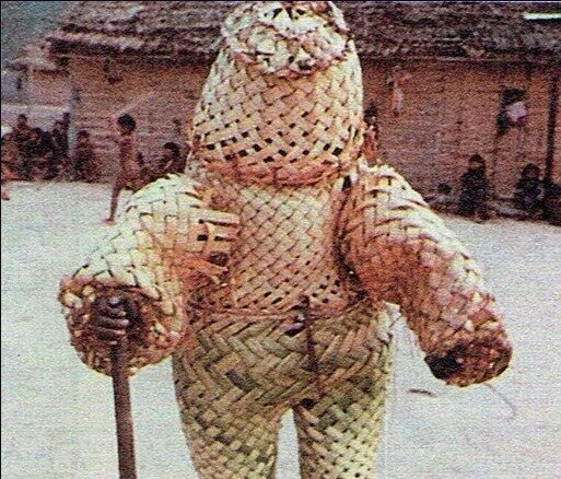 У индейцев из племени каяпо, затерявшемся в верховьях Амазонки, существует миф, согласно которому к людям с гор спустилось странное разумное существо. Самое интересное в этой легенде - подробные детали: "Однажды в горах Поукато-Ти вдруг раздался страшный грохот, а потом оттуда пришел загадочный Беп-Коророти. На нем были странные одежды, покрывавшие его с головы до ног. В своей руке он держал «коп» - страшное оружие, поражающее молнией. Все жители деревни в страхе спрятались в лесу." И до сих пор индейцы в общих чертах помнят как выглядело это существо! Между прочим, смахивает на комбинезон биологической защиты. Здесь следует сделать небольшое отступление. Вообще в мифотворчестве индейцев различные сочетания грома и молнии не такое уж и редкое явление. И в таких индейских мифах речь, главным образом, идёт о знакомых всем нам наблюдаемых природных явлениях - например, описание грома и молнии: "...громовая птица производит гром, хлопая крыльями", или: "гром есть огромный человек, живет на