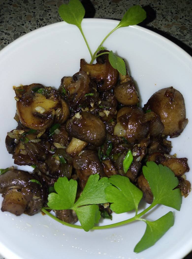 #пасха Ингредиенты: свежих шампиньонов, небольшая луковица, чеснока, перьев зелёного лука, сливочного масла, растительного масла, соевого соуса, воды, чёрного молотого перца Способ приготовления: Грибы порезать, отварить в течение 10 минут. В сковороде нагреть смесь масел, обжарить грибы до золотистого цвета. Лук мелко порезать, отправить к грибам, обжарить. Добавить соус, воду, перец, потушить под крышкой до испарения влаги. Зелёный лук и чеснок измельчить, добавить к грибам, выключить огонь. Дать настояться 5 минут. Приятного аппетита 🌿.