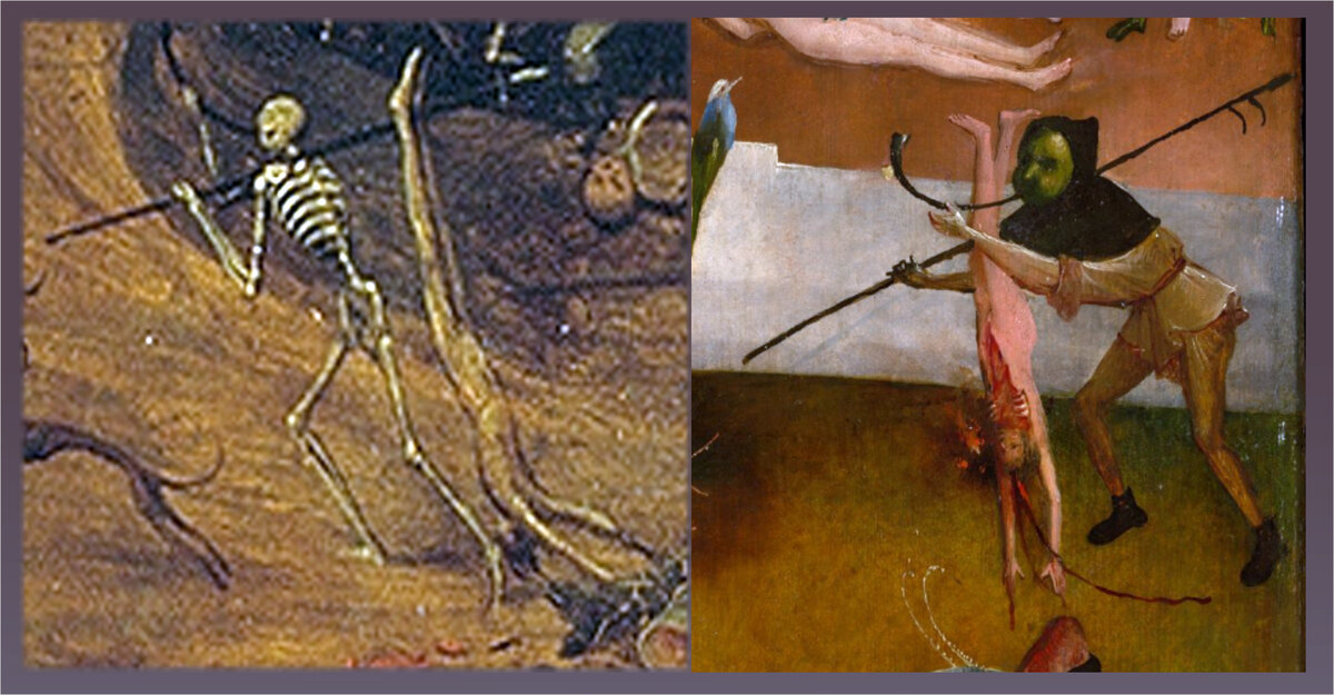 В отличие от концепции долгих, усердных мук Босха, здесь людей просто атакуют скелетная смерть, но если мы приметили вагончик в который грузят грешников, то мы заметим и ещё другое транспортное средство на колёсах. Это другое"движимое", в маскировочном дыму, и оно уже абсолютно под управлением иных сил. "Третья сторона" это по Иеронимусу Босху и побоку всему - это демоническое. Так что стоит отметить, что изображены два лагеря. Есть скелеты, а есть дьяволы, которые едут в каком-то своём "Огнедышащем танке", на нём очень любопытные люки, и фары. Чад. На морде машины прилеплена прокламация- словно на дверях церкви.