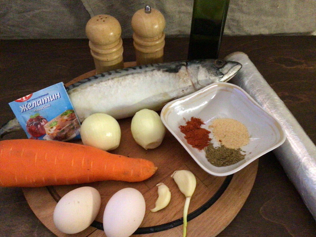 Сегодня я готовлю рулет из скумбрии с овощной начинкой. Скумбрия рыба с очень мягким и жирным мясом, поэтому перед тем, как делать рулет, рыбу лучше 30 минут подержать в морозильнике. Чтобы рулет получился плотным и не распадался добавим желатин. Начинка для рулета может быть любая( яйца, грибы, овощи). Для вкуса надо добавлять специи. Описание приготовления. Готовим начинку. Репчатый лук нарезаем полукольцами и обжариваем на сковородке с добавлением растительного масла, до золотистого цвета. Морковь трём на тёрке для корейских салатов, на длинные полоски. Морковь обжаривать не надо. Отвариваем куриные яйца в крутую, очищаем от скорлупы. Я использую мелкие яйца. Готовим специи. Смешиваем несколько видов специй по вкусу. Я использую сухой и свежий чеснок, специальные специи для рыбы, чёрный молотый перец, красный перец чили, соль. Подготовим рыбу для рулета. Рыбу надо хорошо помыть, протереть бумажной салфеткой. Удалить голову, хвост, плавники. Разрезать по спинке вдоль всей рыбы