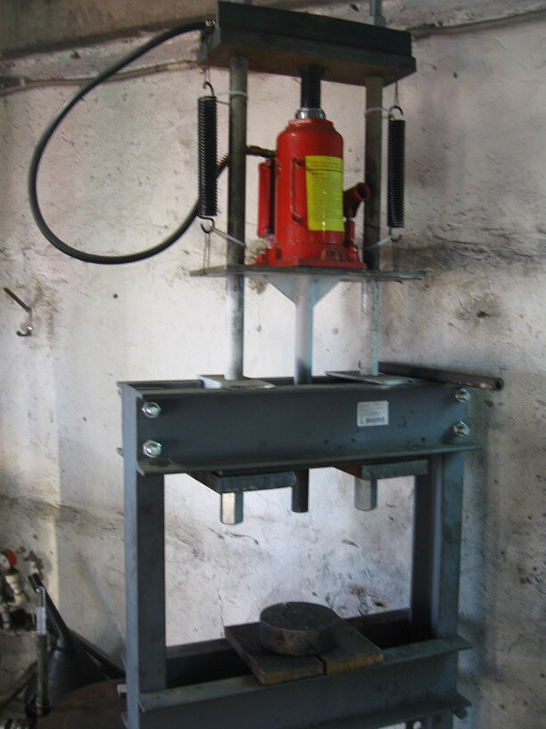 Давно уже работает у меня этот пресс. Брат купил тогда китайский 20 тонн и я срисовал с него размеры рамы. Но рама там (у китайцев) хуже, потому что боковые стойки там не из швеллера, а штампованный профиль (не такие жесткие).