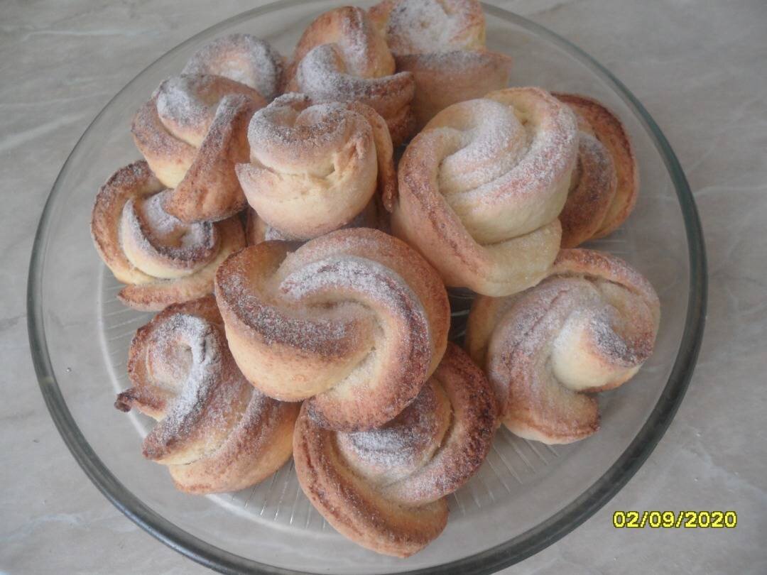 Нежнейшее тесто...Запоминающийся аромат...Легкие в приготовлении...Украшении стола...В общем к приготовлению обязательно!!! #выпечка #сладкаявыпечка #творог #рецептыстворогом #выпечкастворогом #пасхальныйстол #красиваявыпечка #пасха Ингредиенты: муки, творога, сливочного масла, яичных желтка, сахара, соды, уксус, ванилин Способ приготовления: Растереть желтки с сахаром, маслом и творогом. Добавить соду, гашенную уксусом, муку. Хорошо вымесить тесто, раскатать и вырезать кружочки с помощью чашки. Выложить внахлёст по три кружочка. Скатать в трубочку и разрезать на две части поперек. Застелить пергаментом противень. Выложить розочки. Выпекать в разогретой до 180-200 градусов духовке 20-30 минут. Ещё горячие розочки посыпать сахарной пудрой или кокосовой стружкой. тертым шоколадом. P.s. Муки может уйти меньше. Сразу всю муку не выкладывайте.