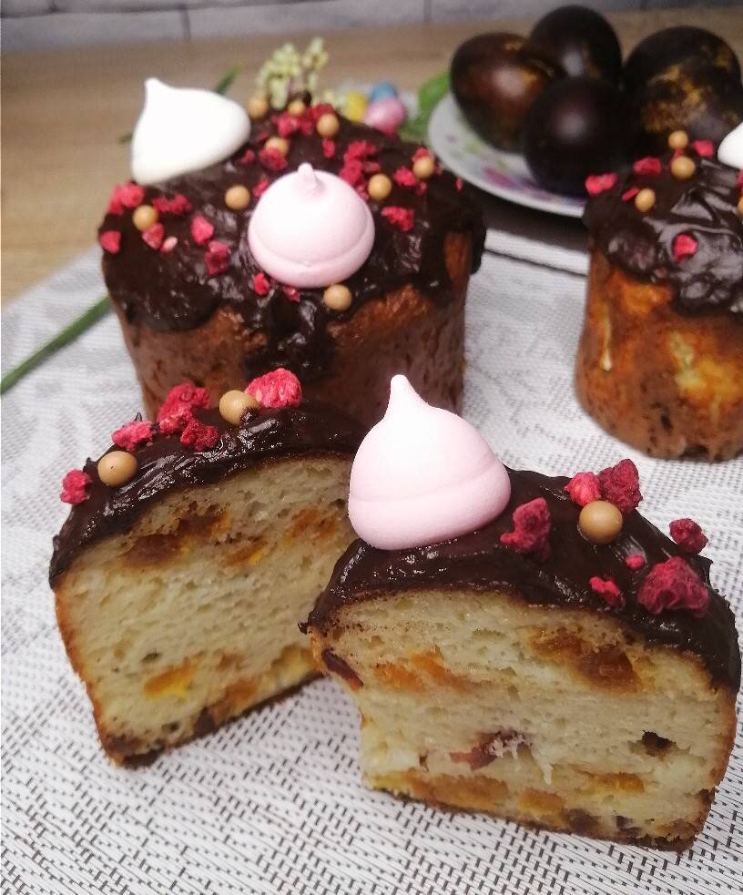#академия Творожные куличи в ПП-варианте. Ингредиенты: творога, сметаны (15%), яйца (к. 1), масла сливочного, муки (у меня дурум), подсластителя Пребиосвит, разрыхлителя, сухофруктов (клюква вяленая, курага), соли Способ приготовления: Творог со сметаной пробиваем блендером до однородного состояния. Добавляем яйца. Вливаем в массу растопленное сливочное масло, добавляем подсластитель, соль, ванилин и перемешиваем. Добавляем в массу вяленую клюкву и нарезанную курагу (сухофрукты я предварительно замочила в горячей воде, промыла и просушила). Смешиваем муку с разрыхлителем и вводим в творожную массу. Замешиваем тесто. Выкладываем тесто в формы, наполняя примерно на 3/4. Выпекаем при 170* 35-45 минут, в зависимости от размера формы. Ориентируйтесь по своей духовке. Готовые куличи я покрыла глазурью и украсила сублимированной малиной. Для глазури: 30 г горького шоколада без сахара +15 г. молока. Нагреть 14-15 секунд в микроволновке, перемешать.