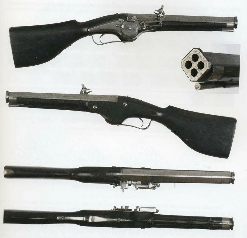 Залповый карабин. Официальное название этого оружия 23-х зарядный залповый карабин с колесцовым замком 1630 года выпуска. К этому еще можно добавить, что у данного карабина германского происхождения было четыре ствола калибра 9,2 мм. Оружие действительно стреляло залпами из всех четырех стволов, и для этого использовались полые цилиндрические пули с пороховой мякотью, а сами стволы были соединены хитроумной системой каналов таким образом, что выстрел из первого ствола инициировал воспламенение зарядов во всех остальных стволах. На полный залп уходило около полминуты. Во время боя перезарядить такое оружие полностью было вряд ли осуществимо и скорее всего после полного залпа далее использовался только один ствол. Существует версия, что данный карабин был разработан для некой специальной группы войск тогдашней Баварии. Противовоздушный кулак. "Люфтфауст", или "воздушный ("противовоздушный ") кулак", это еще один образец германского оружия периода Второй мировой войны, опередивший свое