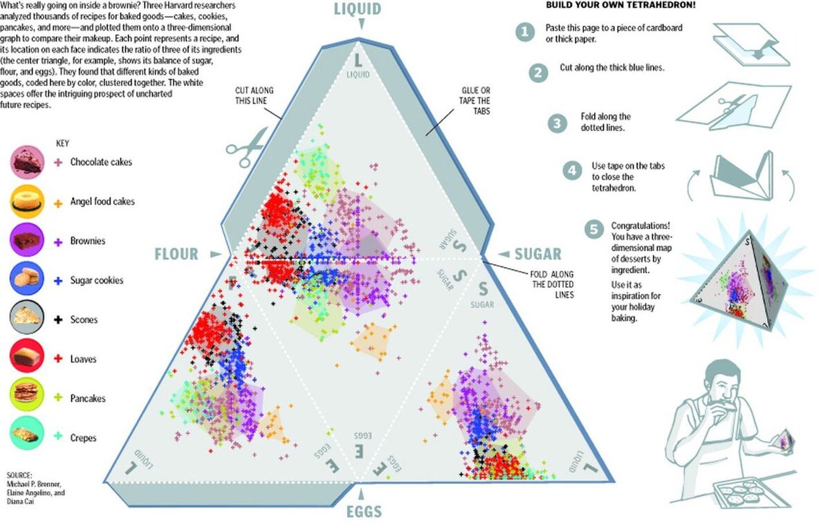 Как на тетраэдры с лепестковыми диаграммами. Несколько лет назад в Гарварде решили скачать несколько тысяч рецептов блинов, печений, бисквитов с сайта allrecipes и построить диаграммы. Представьте себе яйца, молоко, муку: каждый ингредиент на своей оси. Там, где они пересекаются, стоит точка. Каждая точка означает определённые пропорции трёх ингредиентов. Например, кто-то готовит блины в пропорциях 2:2:1. Но рецептов блинов много, пропорции могут до определённой степени отличаться. А раз пропорции отличаются, то и точки будут в разных местах стоять. При этом все точки будут ограничены какой-то областью, за рамками которой будет уже не блин, а что-то другое. К примеру, если в пропорции увеличить число яиц, то будет не блин, а омлет. В Гарварде проанализировали несколько кондитерских изделий и сделали цветные области с точками, расположив их на тетраэдре. Если его собрать, то очень удобно смотреть на рецепты и размышлять о природе брауни или сконов. Но главное – это пустые