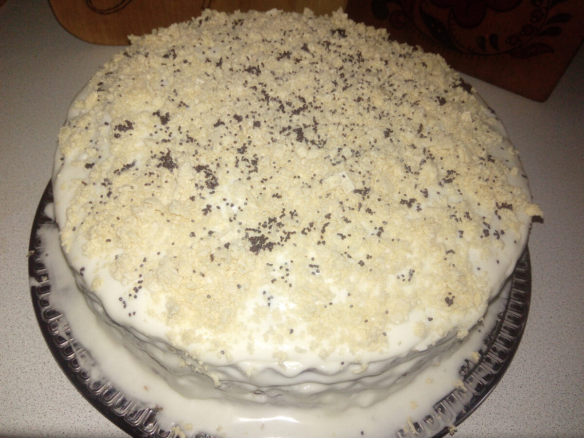 Очень мы любим всей семьей этот тортик, особенно мой папа. И даже доченька есть, хотя к выпечке вообще равнодушна Ингредиенты: Яйцо - 4 штуки, Мука - 2 стакана; Сливочное масло - 200 грамм; Сметана - 200 грамм; Сахар - 1,5 стакана; Сода - 1,5 чайные ложки; Грецкие орехи - 100 грамм; Чернослив - 100 грамм; Мак -20 грамм; Крем: Сливки обязательно 33 % -500 мл; Сахар -5 столовых ложек. Начнем с того, что запарим изюм. Это значит зальем кипятком и накроем, а по прошествии 20—30 минут выложим на бумажную салфетку. Замачиваем чернослив. Чернослив нарезаем, орехи измельчаем Теперь займемся тестом Яйца растираем с сахором до появления белой пены Добавляем растопленное сливочное масло и перемешиваем. Я растапливала в микроволновке. Добавляем сметану, муку и тщательно вымешиваем Тесто делим на три части: одну перемешиваем с маком, вторую с черносливом, третью с орехами. Выкладываем первую часть теста в смазанную маслом форму и ставим в предварительно разогретую до 180 градусов духовку на 20-