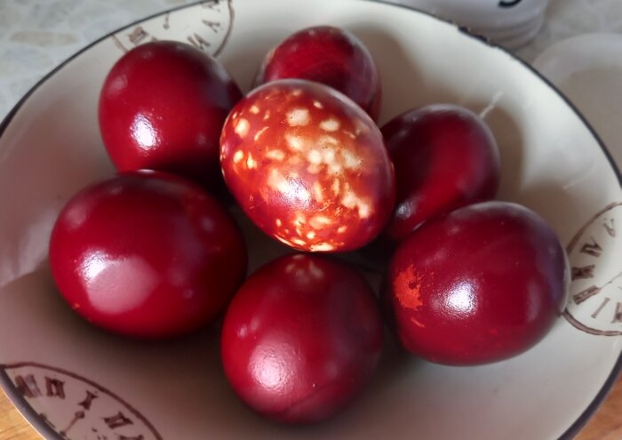 Луковая шелуха никогда не подводит. Такой чудесный натуральный краситель! Если вдруг кто-то не знает, то луковую шелуху нужно опустить в воду, вскипятить, поварить минут 5, накрыть крышкой и оставить настаиваться, например на ночь. Потом из отвара вытащить шелуху, опустить в него яйца, добавить уксус (примерно 1 ст ложка на литр).