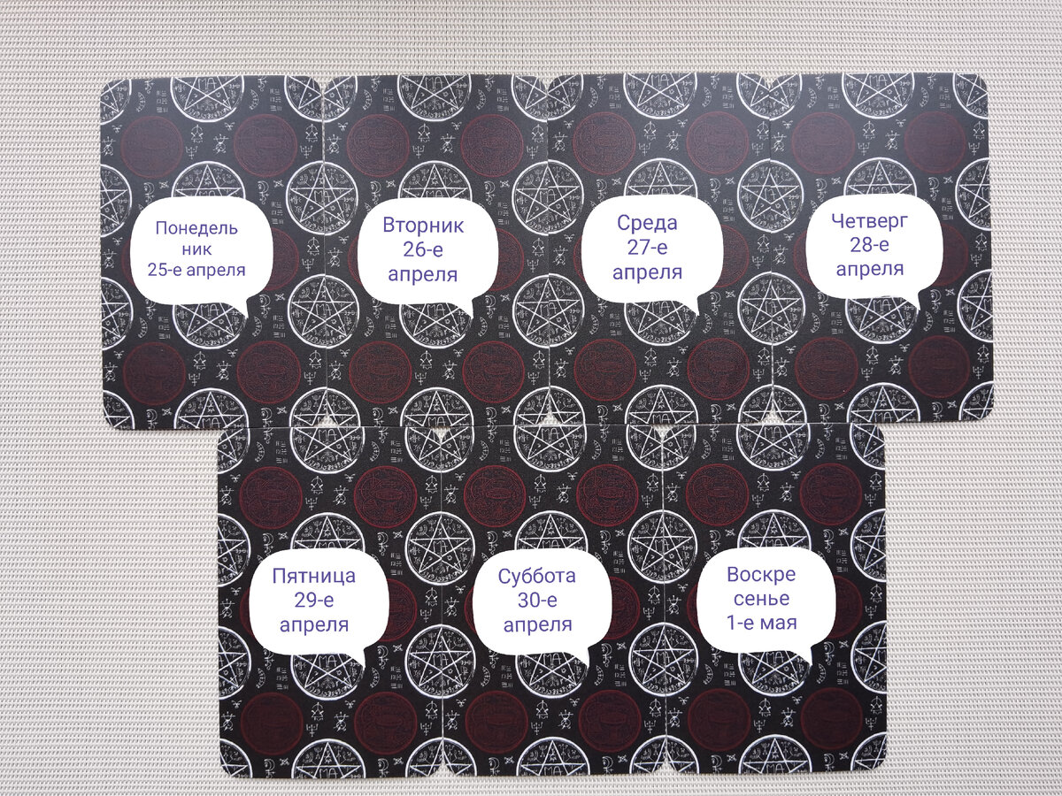 Карта дня даёт нам подсказки как прожить день с максимальной пользой для себя. Приветствую всех! Меня зовут Марина. Буду благодарна за ваши лайки и комментарии, если материал у вас отзывается. Подписывайтесь, чтобы не пропустить новые прогнозы. Итак, мы начинаем! Понедельник 25-е апреля - вызов, конкуренция, борьба за выгодное положение, защита. Отстаивайте свое мнение и свои завоевания. Вторник 26-е апреля - торговля, стабильность, детальный маркетинг, полезные знакомства. Возможно получение прибыли не совсем чистоплотными методами. Среда 27-е апреля - хитрость, интрига, обман, доверчивость. Будьте гибкими, идите не напрямик, а окружным путем. Не теряйте бдительность, ведь обхитрить могут и вас! Четверг 28-е апреля - осведомленность, любопытство, скрупулезность. Сегодня день, когда стоит быть внимательным и уделять внимание мелочам. Пятница 29-е апреля - любовь, эмоциональная связь, праздник, счастье. Откройте свои чувства и воспользуйтесь шансом а с