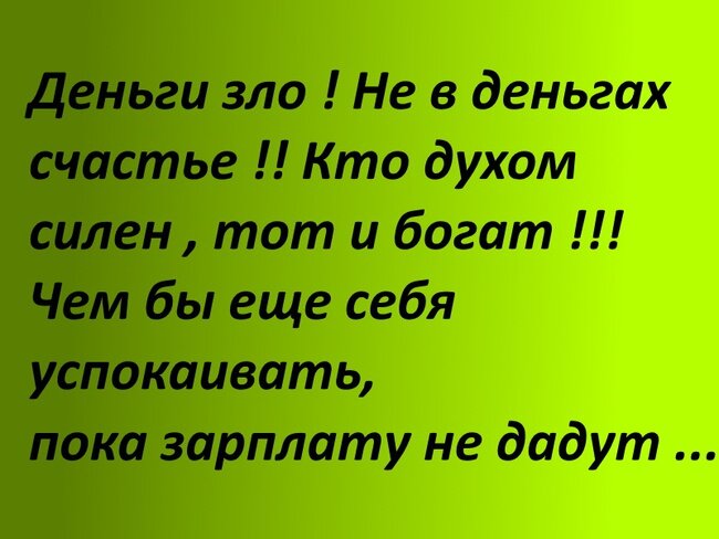 Здравствуйте , мои дорогие читатели ! Сегодня я хочу вас развеселить . Представляю вам сегодня анекдоты про деньги . Ведь это вечный вопрос ! И как поется в песне из кинофильма " Сватовство гусара " : " Ох вы деньги , деньги , деньги , рублики ! Франты , фунты стерлинги да тугрики . Ох день-день-деньжата денежки , Слаще пряника , милее девушки " И что самое интересное , когда человек мечтает стать миллионером , он всегда думает о том как этот миллион потратить , но никогда не думает о том как его заработать !!! Дай человеку уверенности в будущем хоть на час и он тут же возьмет что нибудь в кредит ! Занимать деньги нужно у пессимистов , они заранее знают , что им их не отдадут !!! - Что за узел у тебя на носовом платке ? - Это мама завязала , чтобы я не забыл заплатить за электричество . - Ну и как , заплатил ? - Нет . Она забыла деньги дать . Период полураспада зарплаты равен неделе и от размера зарплаты не зависит !!! Муж жене : - Ты куда собралась ? - В магазин . - Деньги взяла ? -
