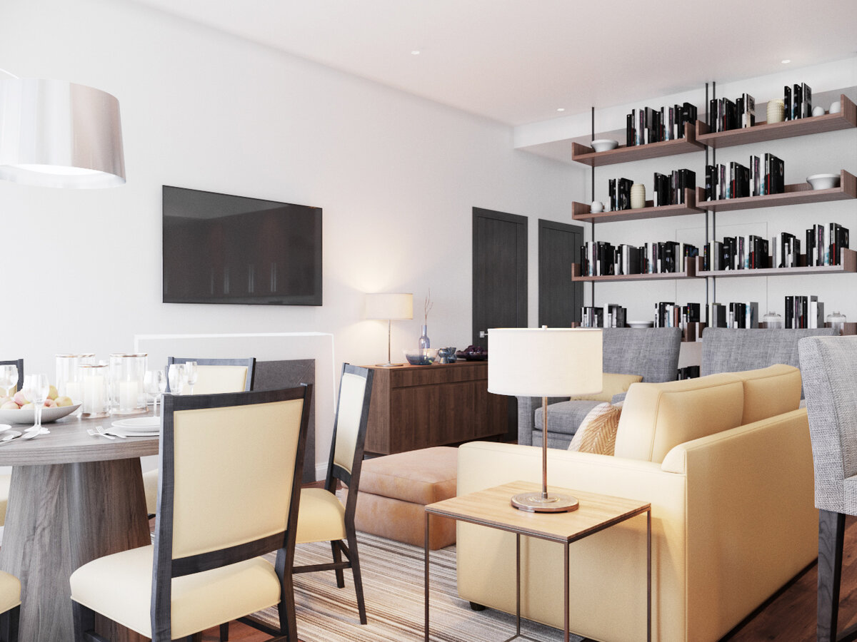 Проект интерьера современной квартиры. Кухня-гостиная условно разделена на несколько зон: обеденная с большим круглым столом, ТВ с диваном и большая кухня. Шикарное угловое окно - главный козырь этой квартиры, и обеденную зону расположили как раз там. Красивый вид, много света - идеально. Стол выбрали круглый, а вместо светильника над столом -огромный высокий торшер. Гостиную зону с ТВ, диваном и комодом выделили полосатым ковром. И чтобы отделить проходной коридор с санузлом - сделали книжные стеллажи. Кухня большая, угловая, да еще и с островом. Поэтому удалось уместить всю возможную технику для современного дома: большая мойка, духовой шкаф, встроенная кофемашина, посудомойка. И даже в торце острова - холодильник для вина.