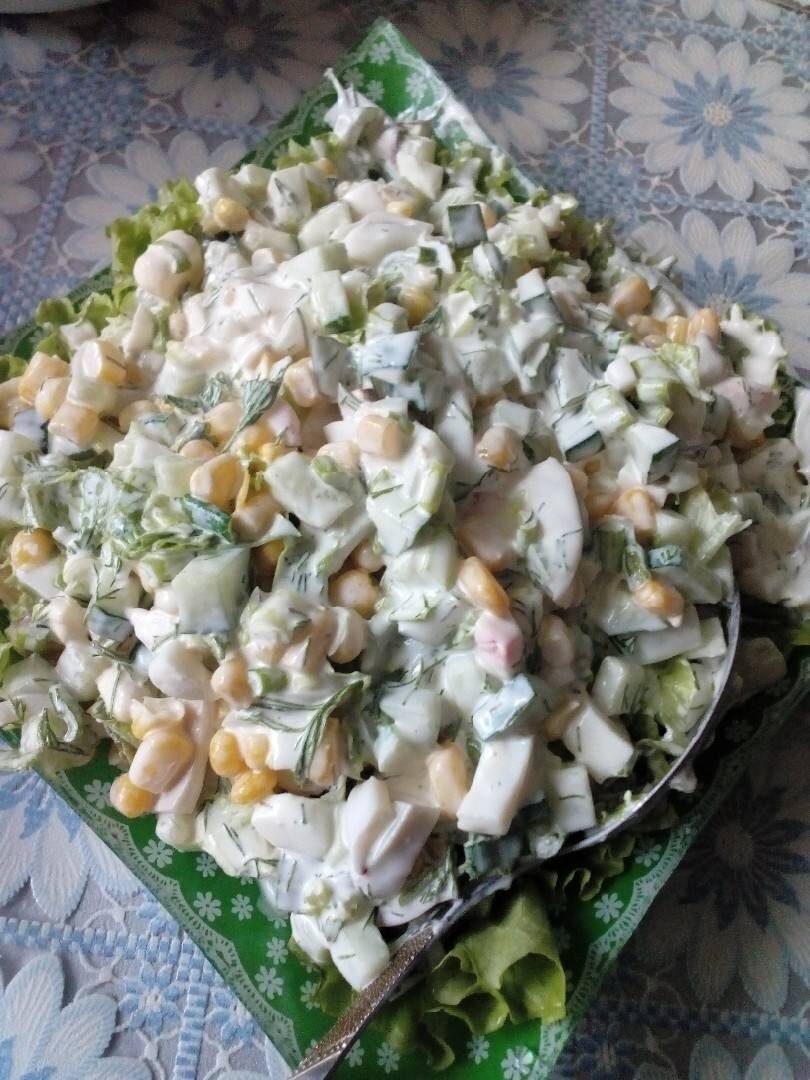 #академия #пасха Простой, вкусный и в то же время праздничный салат. Ингредиенты: Кальмар, Огурец свежий, яйца, консервированной кукурузы, зелени, майонеза, Свежий салат для подачи Способ приготовления: Кальмара почистить, помыть, отварить до готовности, порезать, сложить в салатник. Кукурузу вскрыть, слить жидкость, добавить в салатник. Яйца отварить, охладить, очистить, порубить, добавить в салатник. Огурец помыть, порезать, добавить в салатник. Зелень помыть, обсушить, порубить, добавить в салатник. Заправить майонезом. При подаче украсить свежим салатом. Приятного аппетита. Буду рада видеть Ваш отзыв и Вас моим подписчиком, если понравился рецептю