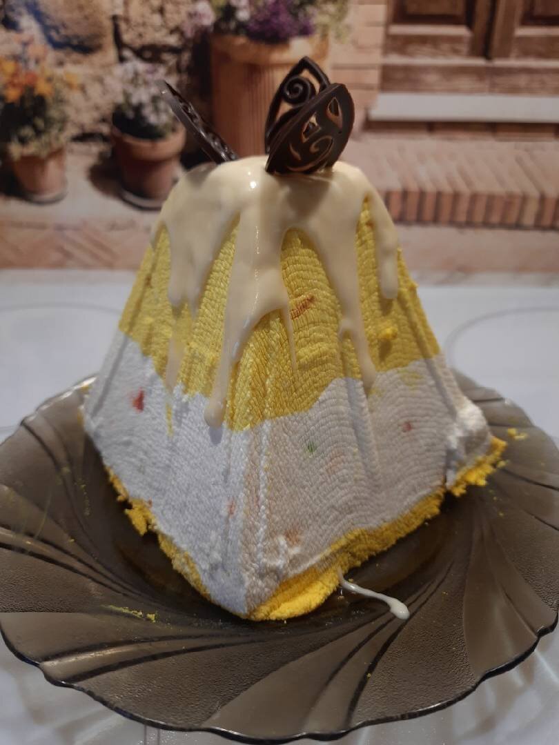 Ингредиенты: творога, творожного сыра, сгущенного молока, цукат, куркумы, белый шоколад, сметаны, масла слив Способ приготовления: Масло комнатной температуры смешиваем со сметаной, творожным сыром, творогом- все пробить блендером, добавить сгущенку по желании ванилин, цукаты (предварительно замочить в кипятке на 10 мин и высушить). все перемешать. Собираем форму для пасочки в один слой выкладываем влажную марлю, часть массы перекладываем в другую миску и добавляем куркуму. теперь в форму выкладываем массу с куркумой, далее белую и завершаем массой с куркумой. Накрываем марлей, ставим груз любой (можно банку с водой 1 литр) в низу по кругу выкладываем бумажное полотенце, чтобы лишняя влага впитывалась и оставляем на ночь в холодильнике. Далее достаем переворачиваем на блюдо, снимаем форму, растапливаем шоколад в микроволновке импульсами по 10 сек. И поливаем сверху.