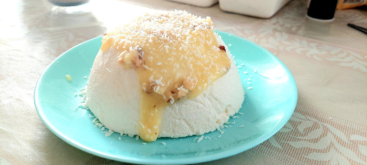 Понадобится: 250 гр творога 70-80 гр сгущенки густой, хорошего качества 40 гр сливочного масла 20 гр лимонного сока, цедра, ваниль, кокосовая стружка, ягодное варенье - любое из списка и по желанию Заливка сверху 1/2 плитки белого шоколада+1 ст.л. сметаны Как готовить: Творог перемолоть блендером или перетереть через сито или на тёрке до однородной консистенции. Взбить миксером теплое масло творог и сгущёнку и остальные ингредиенты до однородной пастообразной массы. Проложить в любую форму марлю (У меня это была просто глубокая тарелочка) . Затем положить в эту ёмкость с марлей творожную массу. Накрыть плоской тарелочкой и поставить в холодильник на 10 часов. Держа ёмкость с творожной Пасхой и крышкой руками, аккуратно перевернуть и снять форму. А затем аккуратно убрать марлю. Все Пасха готова. Сверху полить кремом. У меня это разогретый белый шоколад со сметаной. И ещё сверху насыпала кокосовую стружку. Приятного аппетита