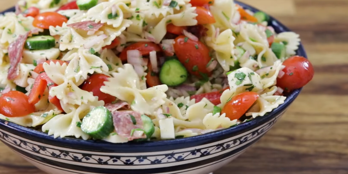 Сытный салат с макаронами, колбасой,c перцем, сыром, а также с помидорами, огурцами и свежей зеленью - в итальянском стиле. Вам потребуется: Макароны "по-флотски" -500 г Сыр твердых сортов - 100 г Колбаса типа сервелат - 100-120 г Огурцы - 2 шт. Помидоры - 2-3 шт. (в зависимости от размера) Огурцы - 200 г Лук репчатый - 1 шт. или любая другая зелень по вкусу Чеснок - 2 зуб. Масло растительное - для жарки Соль - по вкусу. 1. Макароны отварить в подсоленной воде до готовности и откинуть на дуршлаг. 2. Колбасу нарезать . Огурцы нарезать кружочками. Помидоры нарезать кубиками размером чуть меньше огурцов и так же перец 3. Лук соединить с колбасой и огурцами. Добавить зелень, перемешать. Сыр порезать кубиками . 4. Смазать сковороду маслом. Обжарить лук до золотистого цвета. 5. К луку добавить колбасу, огурцы и помидоры. Перемешать и жарить еще 10 минут 6. Снять с огня. Посыпать сверху натертым сыром. 7. Укроп мелко порубить и посыпать готовый салат. 8. Сверху полить немного маслом. 9. Ост