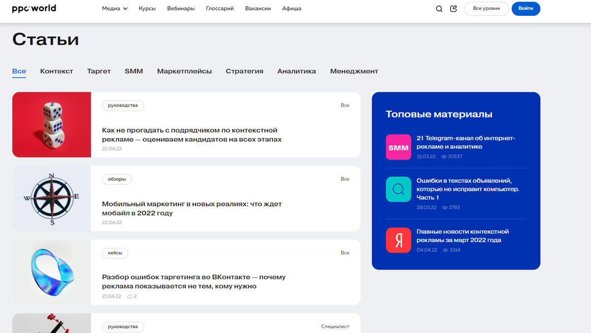 В интернете огромное количество информационных ресурсов, на которых можно найти много полезного для развития себя, своего проекта или бизнеса. Идея создания Creator Space завязана на том, чтобы находить такие ресурсы и делиться ими с той массой людей, которые стремятся к развитию и прогрессу. PPC world Сайт с огромным количеством статей, которые заменяют курсы. Не знаете как решается определенная задача по маркетингу? Или по тайм-менеджменту? Или быть может у вас проблема с настройкой таргета? Также на сайте есть курсы. Лично ими не пользовался, но если тут статьи имеют крайне высокое качество, то и курсы будут на уровне. Весь материал разбит по разным уровням знаний и навыков.