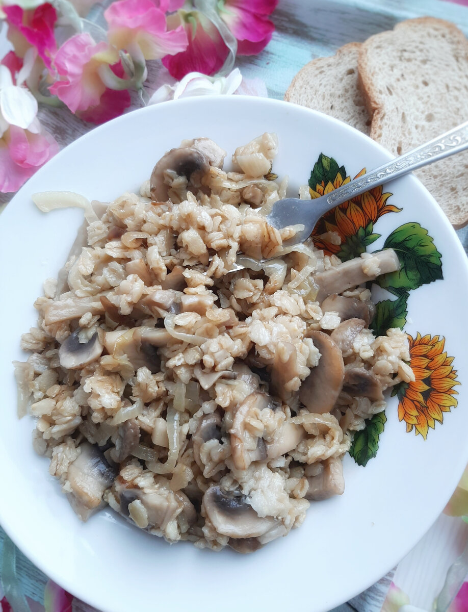 🍏 Разогреваем сковороду и обжариваем на масле сначала лук, а затем грибы.