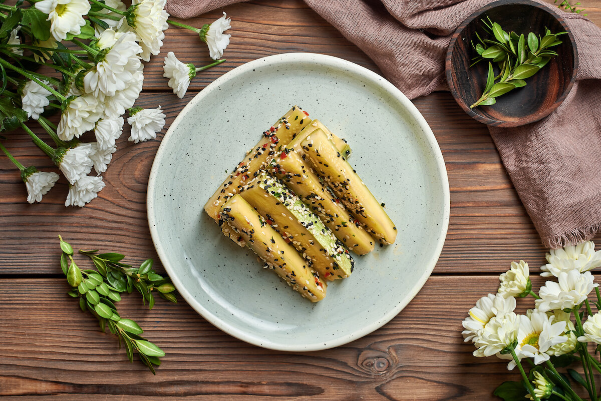 Сочные кабачки, маринованные в азиатских специях с добавлением кунжута – освежающее пряное блюдо для летнего обеда. Кабачки содержат большое количество клетчатки, витамин Е, фолат, калий, магний и кальций.