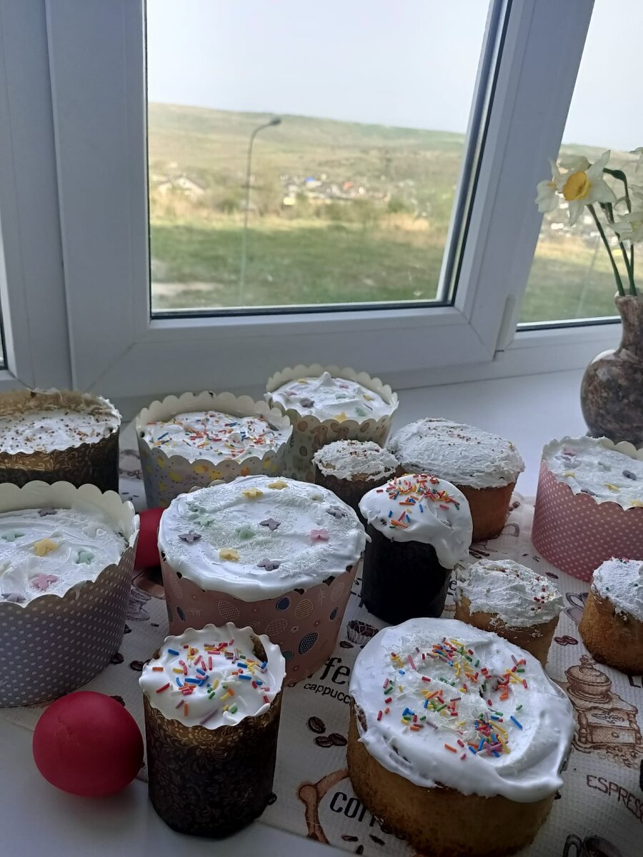 Христос Воскрессе! Поздравляем всех с праздником, мира и добра Вам и Вашим семьям! Сколько можно печь куличи после Пасхи? (ответ в конце) Рецепт на пасхальное тесто. Куличи выходят очень нежные, мягкие и в меру влажными. Результат на фото (некоторые пасочки поднялись не до конца - это потому что и теста в форму положили маловато - учтём на будущее). Нам понадобится: Опара: 300 мл Молока 18 г. сухих дрожжей ил 50 г. свежих 200 г. Муки 20 г. Сахара Сдоба : Яйца - 6 штук Сахара 300-350 г Щепотка соли Сметана 20% - 150 гр. Мука - 800 гр. Сл. масло - 200 гр. Изюм - 300-305 гр (залить кипятком, потом высушить) Цукаты 100-150 гр. (залить кипятком, потом высушить) если тесто получается жидким, то по чуть чуть добавлять муки до нужной консистенции Процесс: Опара - все ингредиенты нагреть до комнатной температуры, всё смешать, далее накрыть полотенцем и оставить на 30-35 минут. Сдоба - смешиваем сметану, яйца, сахар и соль. полученное вливаем в настоявшуюся опару, перемеши
