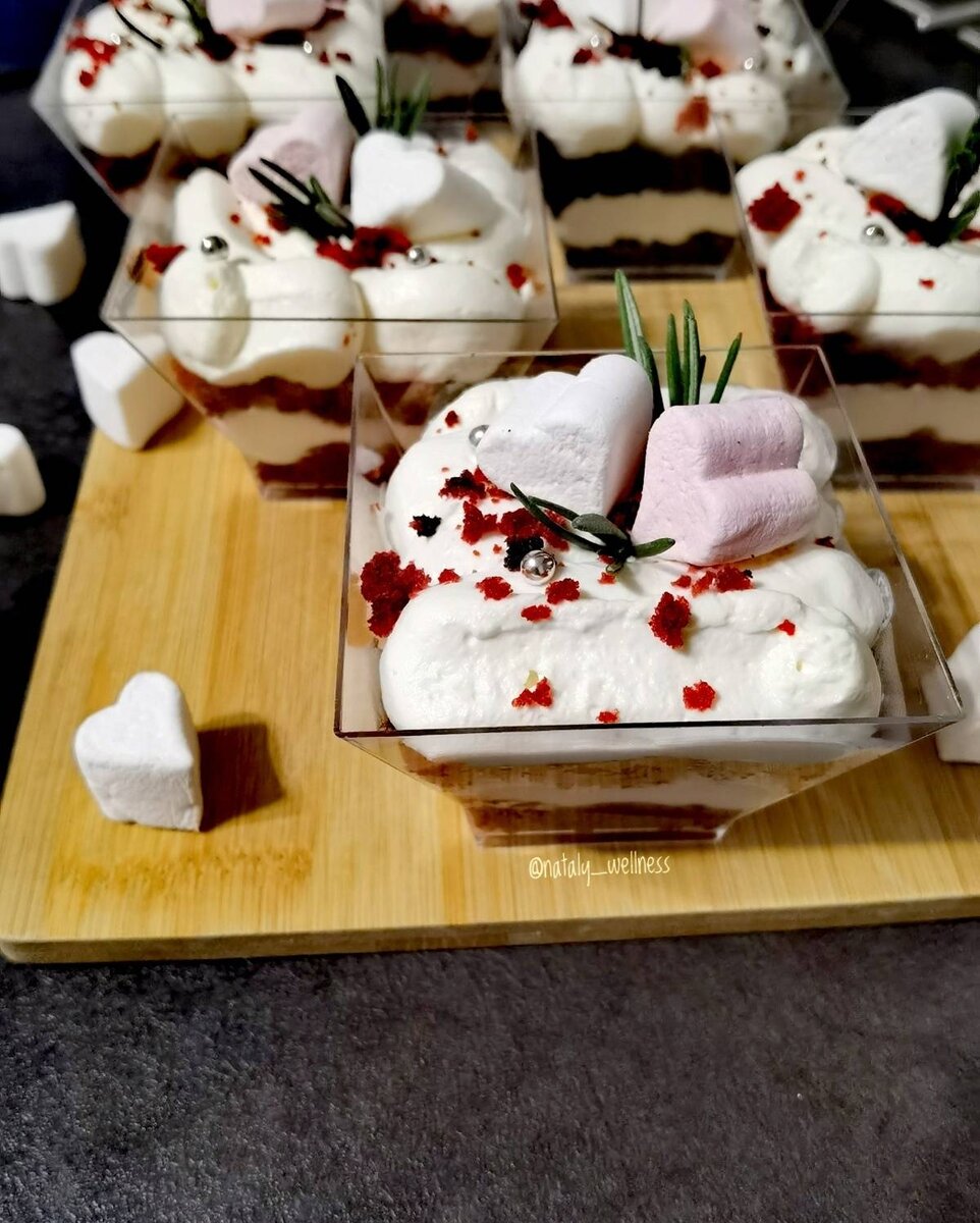 Вариация на тему одного из самых любимых тортов в нашей семье -"Красный бархат" Классика и ничего лишнего. Бисквит и сливочный крем-чиз #академия #порционный десерт #безвыпечки Ингредиенты: бисквит "красный бархат" (рецепт ниже), крем-чиз, творожный сыр, сливки жирность от 30%, сахарная пудра Способ приготовления: Бисквит измельчить в крошку руками. Творожный сыр комнатной температуры смешать со сливками и сахарной пудрой до однородной массы. Выложить слоями в креманки: бисквитная крошка - крем - бисквитная крошка -крем. При желании слой бисквита можно пропитать молоком. Украсить на свой вкус. У меня маршмеллоу, веточки розмарина и крошка бисквита. Наслаждаемся!