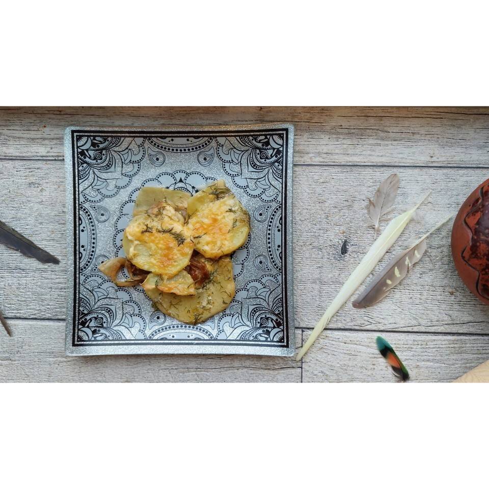 Выложить лук Картошку Тертый сыр Запекать при 220°.