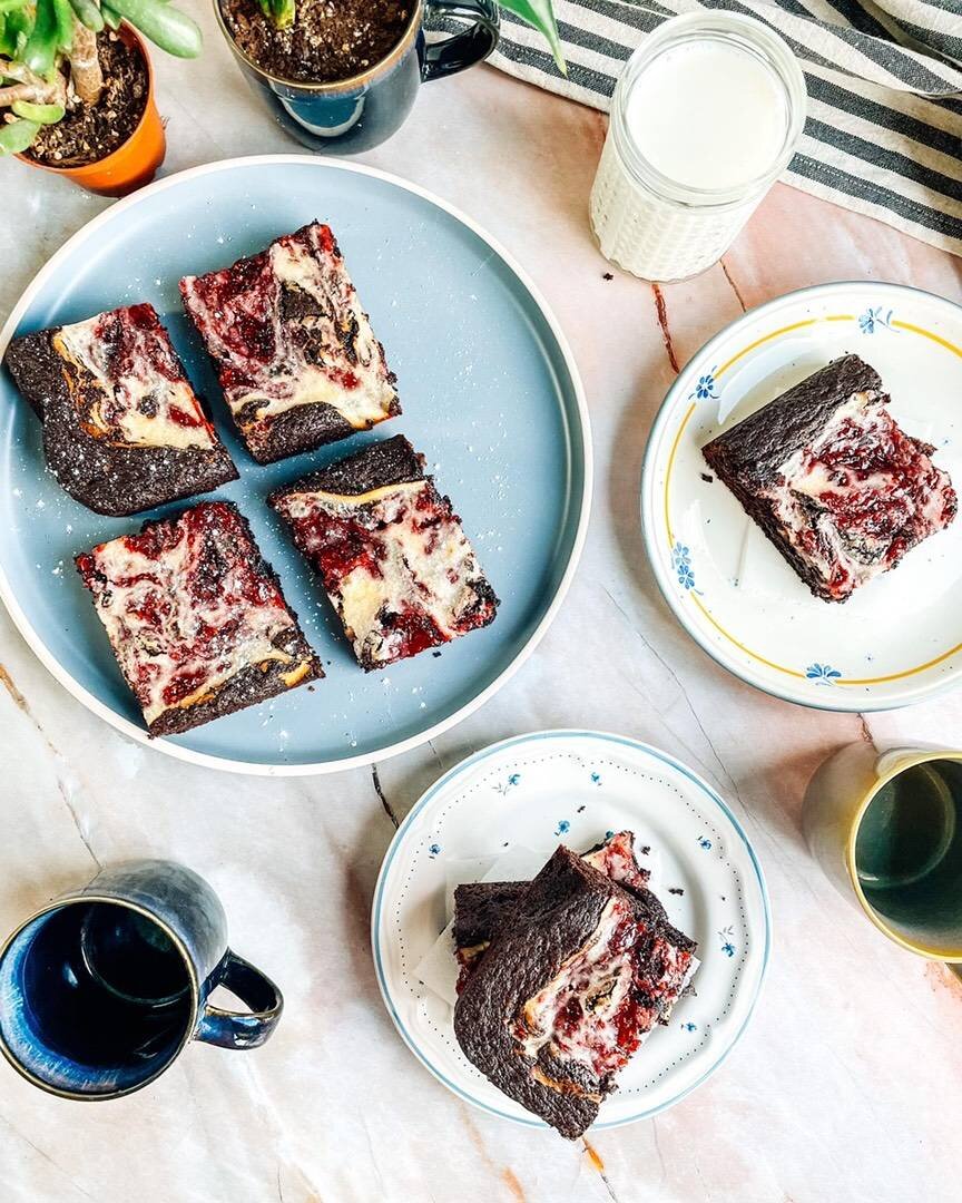 Распределить рандомно сырную массу поверх брауни, затем так же малиновое варенье. Создать узоры ножом :) * Выпекать при 180° 20-22 минуты или до тех пор пока верх не подсохнет. Не перепекайте, слегка влажное всегда лучше сухого :)