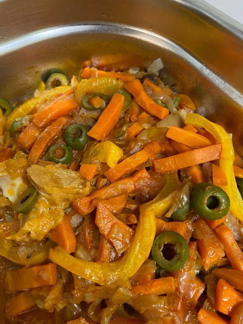 Ингредиенты: - рыба, треска (замороженное филе до обрезки костей), больших морковки, луковицы, желтых болгарских перца, гр оливок без косточки, Соль, Перец, Томатная паста, Лавровый, Мука (для обвалки), Подсолнечное масло