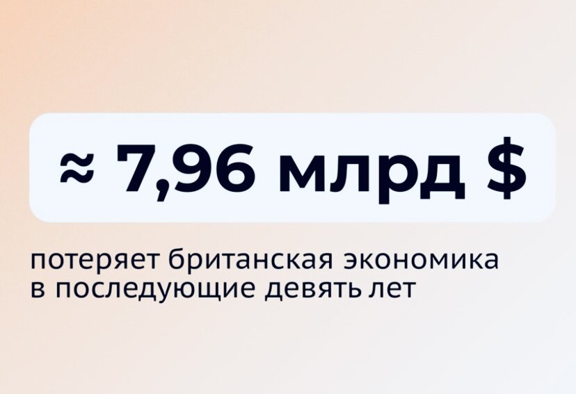 Страна потеряет 6,2 миллиарда фунтов стерлингов (около 7,96 миллиарда долларов) за девять лет. Самый большой ущерб будет вызван запретом на поставки «предметов роскоши»: автомобилей Bentley, Aston Martin и сумок Burberry.