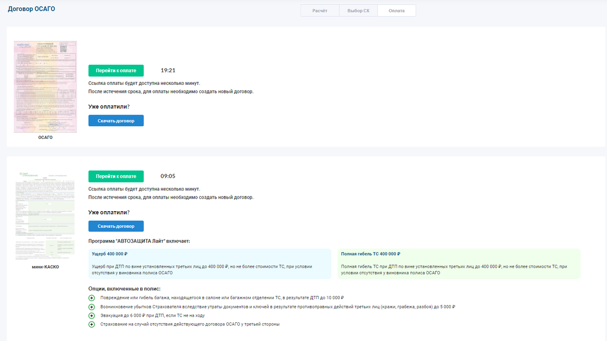 Сценарий первый. Клиент доверил тебе оплату полиса. Кликни на “Перейти к оплате” и сразу попадешь на эквайринг страховой компании. Ссылка живет от 20 минут до нескольких часов. По истечении срока система предложит обновить ссылку. На этой же странице можно скачать полис ОСАГО.