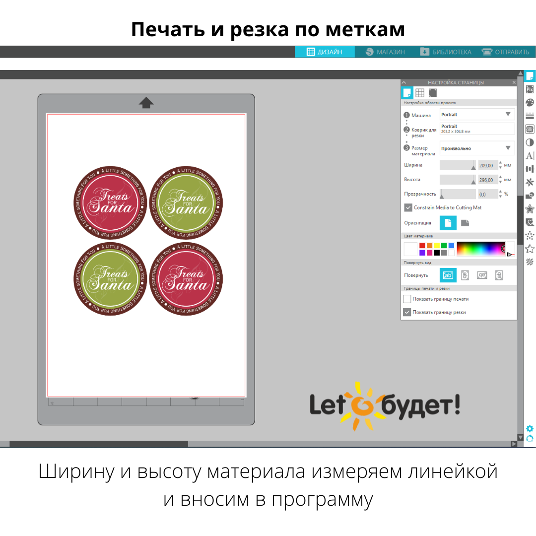 Макет для печати загружаем в Silhouette Studio в растровом формате png, jpg, bmp. Данное изображение вместе с метками распечатываем на принтере после отрисовки контура резки и проставления меток совмещения. Нарисованный контур резки распечатан не будет, это линии, по которому вырезает плоттер. https://www.silhouetteshop.ru/shop/materialy-dlya-rez..Видео про частые ошибки при печати и резке по меткам: https://vk.com/video-108609230_456239206