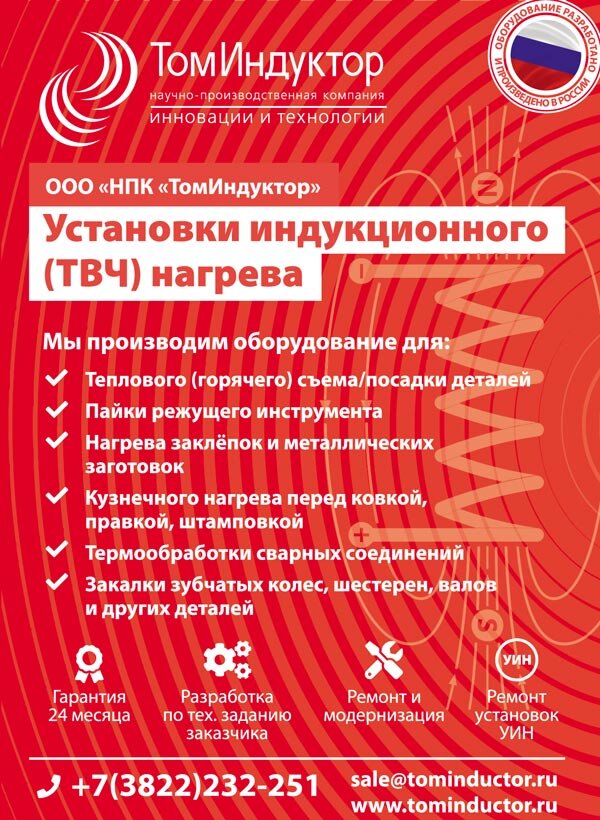 ООО "НПК "ТомИндуктор" оборудование для железной дороги РАЗРАБОТКА И ИЗГОТОВЛЕНИЕ ПРОМЫШЛЕННОГО ОБОРУДОВАНИЯ НА ОСНОВЕ ТЕХНОЛОГИИ ИНДУКЦИОННОГО НАГРЕВА ООО «НПК «ТомИндуктор» - это научно-производственная компания, специализирующаяся на разработке и изготовлении промышленного индукционного нагревательного оборудования различного назначения. Наш коллектив имеет обширный опыт внедрения оборудования и технологических решений от Хабаровска до Минска, и опыт работы с таким компаниями, как АО «Уральские локомотивы», железнодорожные предприятия России, Украины и Белоруссии, АО «Хабаровская производственно-ремонтная компания», ЗАО «Псковэлектросвар», ООО «Сибирская генерирующая компания» и другими промышленными предприятиями, где может использоваться технология индукционного нагрева, например: Сегодня мы можем предложить нашим клиентам: Наша компания предлагает Вам следующие услуги: Гарантийный срок эксплуатации всех видов нашего оборудования составляет 24 месяца. Мы осуществляем доста