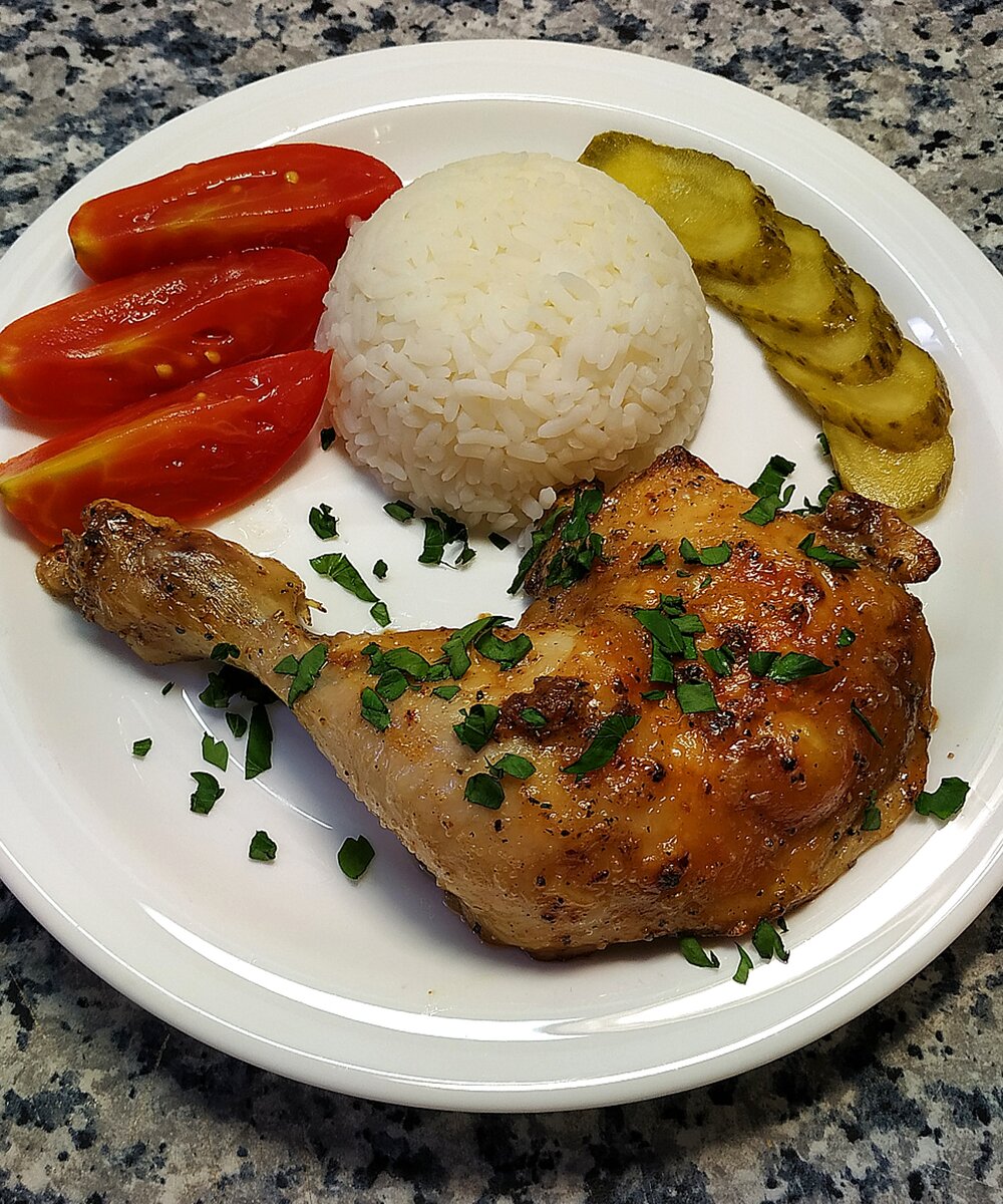 Вкусный и очень простой рецепт приготовления запеченных куриных окорочков. Ингредиенты: окорочка куриные - 2 шт. специи по вкусу: хмели-сунели, черный и красный перец, паприка, соль, сахар, чеснок - 3 зубчика майонез - 50 гр. 1. Замариновать окорочка, оставить на 30-60 минут. 2. Выложить на противень. Запекать при 180 гр. 60 минут На гарнир отваренный рис, петрушка, помидоры и маринованные огурчики. ПРИЯТНОГО АППЕТИТА! #окорочка запеченные #курица рецепты #вкусный ужин Видеорецепт: