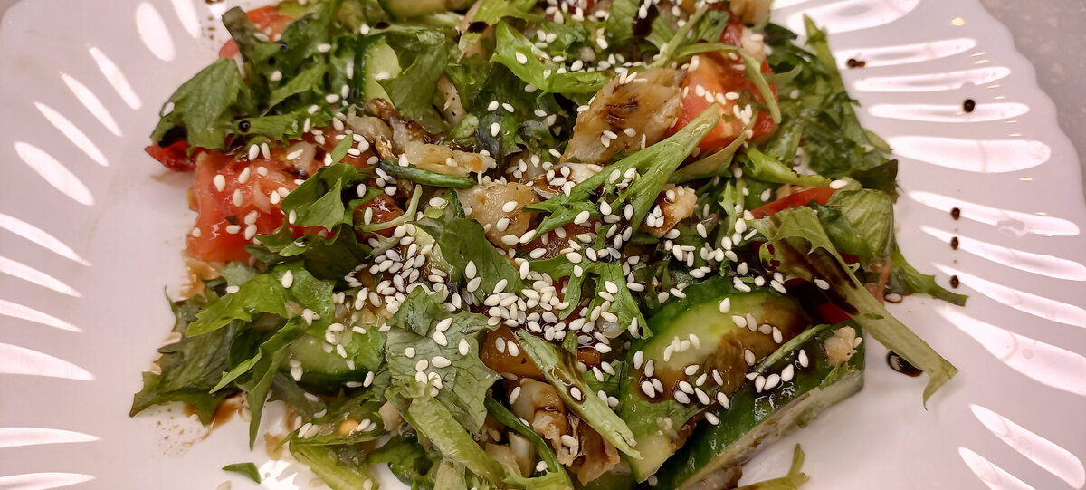 Овощной салат занимает почетное место в меню всех тех, кто придерживается здорового образа жизни, ведь он богат полезными микроэлементами и витаминами Комбинируя и меняя ингредиенты, вы можете каждый раз получать полезный салат с новым вкусом что нам потребуется для приготовления: шаг 1 Рыбу посолить и поперчить по вкусу. Поместить в разогретую до 200 градусов духовку и запекать примерно 12 минут. Запеченную рыбу немного остудить и разобрать на небольшие кусочки Шаг 2 Для салатной заправки смешать оливковое масло, соевый соус, сок лимона, чеснок(пропущенный через пресс), соль и перец по вкусу Шаг 3 выкладываем в емкость салатные листья Шаг 4 нарезаем помидоры и огурчики ШАГ 5 Рыбу разбираем на небольшие кусочки. И отправляем к овощам Шаг 6 Заправляем наш салат заправкой. Все перемешать. Готовый салат посыпать семенами кунжута Наш салат готов! Отличный вариант для ужина. Получается очень вкусно Приятного аппетита!!! Делитесь в комментариях своими рецептами салатов! Будет интере