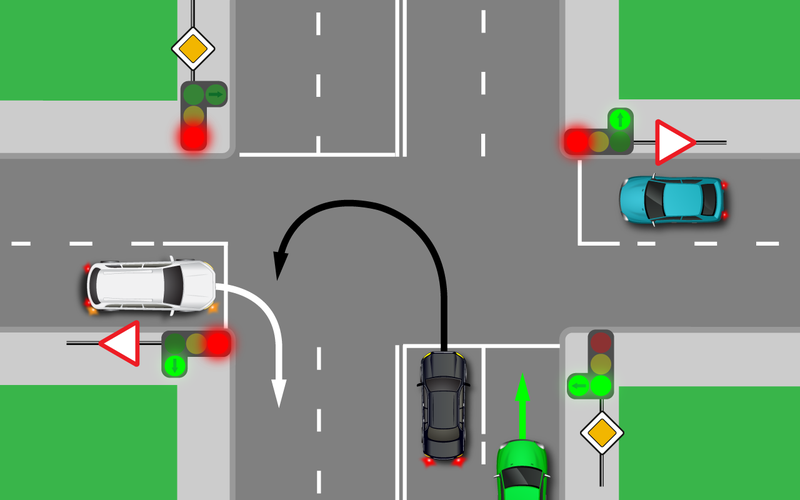 Как правильно проезжать перекрестки, на которых есть светофоры со стрелкой? Какие подвохи они могут скрывать? Одновременное маневрирование Бывают спорные ситуации, в которых не каждый автомобилист может сориентироваться вовремя. Например, на рисунке ниже изображены две машины. Водитель черного транспортного средства собирается совершить на перекрестке разворот, а человек, управляющий белым автомобилем, в тот же самый момент поворачивает направо. Кто в таком случае должен уступить дорогу? Многие считают, что приоритетом не обладает ни белая, ни черная машина. Ведь со времен обучения в автошколе все мы помним, что при движении под стрелку необходимо пропустить всех остальных. Поэтому ситуация на первый взгляд кажется безвыходной. Но это не так. Здесь стоит вспомнить пункт 13.5 Правил дорожного движения. В нем говорится о том, что при зеленой стрелке, горящей одновременно с желтым либо красным сигналом, автомобилист должен уступить дорогу всем, кто едет с других направлений. Однако на рис