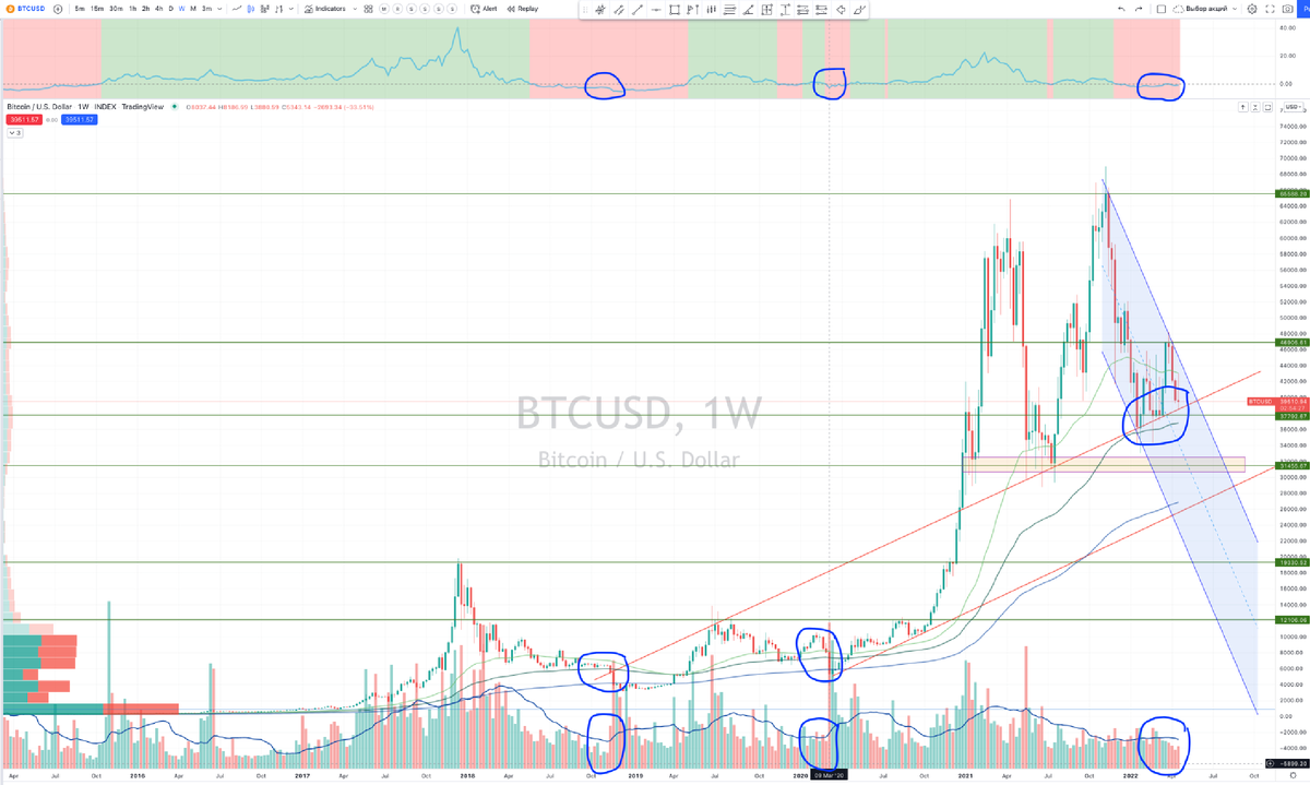 В настоящее время многих интересует вопрос криптовалют и инвестиций в них как в альтернативу фондовому рынку. Предлагаем вашему вниманию обзор самой распространненной криптовалюты, обладающей максимальной капитализацией - Bitcoin $BTC. Так как $ВTC является ликвидным активом с большой капитализацией, к нему могут применены методы технического анализа, которые используются и при анализе фондового рынка и рынка сырья. $BTCUSD - Исторический хай был достигнут 10 ноября 21 года и с тех пор котировки $BTC сформировали движение в нисходящем канале (обозначен голубым цветом на графике). Для того что бы попробовать спрогнозировать дальнейшее движение актива, предлагаем посмотреть немного на движение BTC начиная с 2015 года на недельных графиках. Как мы видим, периоды наибольшего роста на те периоды, когда индикатор Relative Strenght, показывающая силу $BTC по отношению к индексу S&P (верхняя часть графика) был > 0, т.е был зеленым. В процессе роста актива, очень сильную поддержку ему оказыв