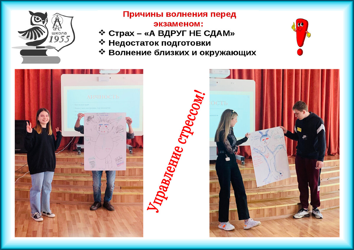 «Управление стрессом. Как подготовится к экзамену» В период весенних каникул специалистами службы психолого-педагогического сопровождения школы №1955 города Москвы были проведены интерактивные занятия с учащимися 9 и 11 классов «Управление стрессом. Как подготовится к экзамену».⠀ Ребята познакомились с основными способами снижения тревожности в различных стрессовых ситуациях.⠀ Участники нарисовали образы «Подготовка к экзаменам», «Сдача экзамена», «Ожидание баллов», «Жизнь после экзаменов». Наделили их психологическими характеристиками, увлечениями и ответили на вопрос «Чему этот образ может меня научить?». Подростки пришли к следующим выводам:⠀ 👉 эти образы могут научить достижению целей; ⠀ 👉 экзамены можно сдать и пережить;⠀ 👉 всегда есть способ себе помочь; ⠀ 👉 после экзамена жизнь не заканчивается, а только начинается! В конце игры ребята ответили на вопрос: «Получили ли они то, за чем приходили на занятие?» Вот ответы: 👉 «Да, я теперь понимаю, что можно делать, когда испыт