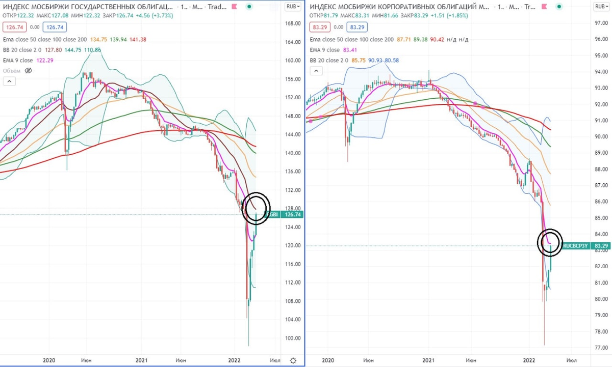 в продолжении данного аудиоподкаста - https://zen.yandex.ru/video/watch/626648f622e6cb08a43456ce следует учитывать, что сейчас RGBI торгует на сопротивлении уровня медианной полосы Боллинджера 128 пунктов, а корп. индекс облигаций на уровне ЕМА9 83 пункта. По большому счёту, если ЦБ РФ смягчит ДКП в виде снижения ключевой ставки до уровня 10% , то данные два индекса очень хорошо порастут до сопротивление по RGBI это уровень ЕМА200 красная линия (142 пункта), а по корп. индексу облигаций так же уровень ЕМА200 красная линия (90 пунктов). Пока говорить о том, что ЦБ РФ снизит ключевую ставку ниже 10% годовых считаю преждевременным. #облигации #техническийанализ #rgbi #корпоративныеоблигации
