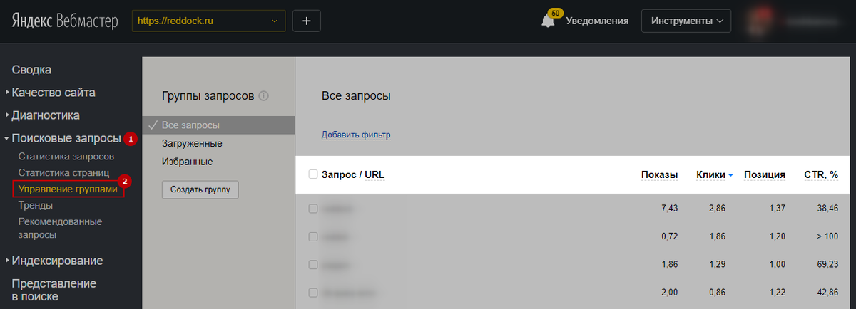Рассказываем, как проверить позицию сайта в поисковиках и какую роль в этом играет хостинг. Чем выше позиция сайта в поисковой выдаче — тем больше вероятность перехода на ресурс пользователем. Поэтому понимать, на каком месте находится онлайн-проект очень важно. Это знание поможет найти новые способы повышения рейтинга. В заметке покажем, где посмотреть текущую позицию сайта в поисковых системах и как на нее влияет хостинг. Как проверить позиции сайта Узнать о текущих позициях онлайн-проекта можно разными способами: вручную, с помощью Google и Яндекс, аналитических сервисов. Самое простое и быстрое — обратиться к Яндекс.Вебмастеру или Google Search Console. К системам имеет доступ владелец сайта. Если он ограничен, запросите его по почте. Для проверки позиции сайта в Яндексе перейдите в Яндекс.Вебмастере в Поисковые запросы (1) → Управление группами (2). Автоматически станет доступна группа «Все запросы». В таблице будет отображен «Запрос», «Показы», «Клики», «Позиция» и «CTR». Отфильт