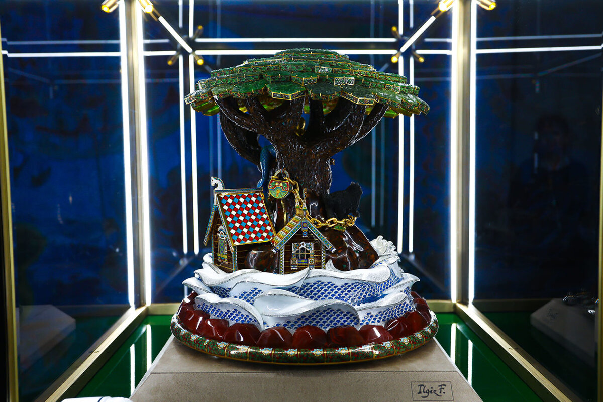 Сложность «Лукоморья» состояла в том, чтобы соединить в единую композицию множество объектов. Ильгиз Фазулзянов не просто справился с этой задачей, но, кажется, использовал в часах едва ли не все техники ювелирной отделки, известные на территории России. То, что кажется корой дерева – не что иное, как эмаль. Бьющиеся о ствол дуба волны – похоже, резьба по камню. Крыши и наличники домов – явно эмаль в сочетании с инкрустацией.