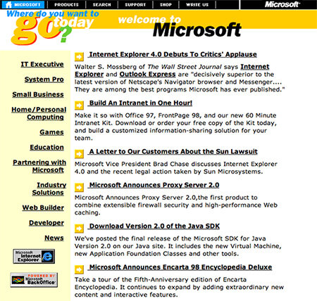 В web дизайне стараются избегать стиля 1990-х годов. Все гонятся за модой, никто не хочет спотыкаться, петляя в конце этой гонки. А каким был дизайн сайтов 90-х? В то время пользовались спросом приемы, выглядящие уныло по сравнению с современным пестрым разнообразием заграничных и русских сайтов. В первую очередь дело касается типографики. Раньше люди считали, что чем больше различных шрифтов используется в одном макете, тем лучше. Причем совмещались абсолютно разноплановые шрифты. А если их сделать разноцветными, то будет еще круче. Как выглядели известные сайты в 1990-х Ограниченные возможности веб-дизайна 90-х ощущали на себе не только рядовые веб-дизайнеры, но и вполне солидные, серьёзные компании. Авангард IT-индустрии. Не верите? Тогда извольте взглянуть, как выглядели их сайты в 1990-х! В 1990-ых очень многие люди, которые открыли для себя Всемирную паутину, создавали персональные сайты. Оно и неудивительно – раскрученных с