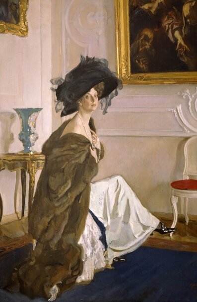 Княгиню Ольгу Константиновну Орлову в свете называли «самой элегантной женщиной Петербурга» и «первейшей при дворе дамой». Ее портрет написал Валентин Серов в 1911 году и, тем самым вызвал неоднозначное отношение зрителей. Поза княгини кажется изломанной и она выглядит несколько странно. Из-за этого до сих пор возникают дискуссии,. Кто-то считает, что героиня портрета смотрится нарядной пустышкой, а кто-то полагает, что женщина исполнена гордого достоинства светской львицы. Русский меценат и коллекционер князь Щербатов скептически отметил: «Воспеть» женщину, подобно великим итальянцам, ставившим её на некий художественный пьедестал, не впадая при этом в пошлую идеализацию некоторых портретистов, модель «подсахаривающих»… Серов не умел. Какой там сахар Серова, лишь бы горчицы не подложил! Как было не использовать исключительно нарядный облик княгини Ольги Орловой, первой модницы Петербурга, тратившей на роскошные туалеты огромные средства и ими славившейся? Князь сетует, что ху