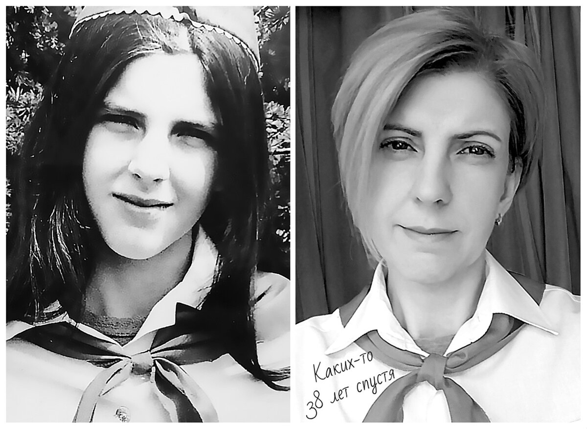 П.С. На втором фото, кстати, (где через 38 лет) галстук моего мужа, реальный галстук в котором он ходил в школу. Его мама умудрилась сохранить эту, теперь уже, практически реликвию. Здорово, когда сохраняются такие вещи! Вот у меня даже фоток из пионерского периода не осталось - эта, очень нелюбимая мной когда-то, а теперь по факту - единственная моя детская фотка, где я в пионерском галстуке...