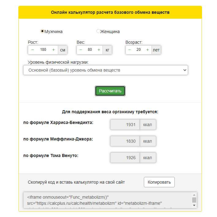 Для начала нам нужно определить сколько ккал необходимо конкретному человеку. Для этого можно использовать формулы базового обмена. Обычно полученные данные умножают на коэффициент от 1,2 — 2,5 в зависимости от образа жизни человека. Если человек работает в офисе, не занимается дополнительно спортом, то его базовый обмен умножают на 1,2). От этой цифры мы и будем отталкиваться.
