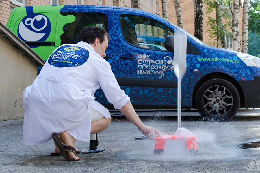 Водная ракета Немногие знают, что из обычной пластиковой бутылки можно создать отличную водную ракету, все что нужно – это увеличить давление внутри! Готовим самостоятельно: Сделать водную или, если совсем правильно, пневмогидравлическую, ракету несложно. Все, что нужно, это обычная полуторалитровая пластиковая бутылка, велосипедный насос и резиновая пробка. Придется немного повозиться, чтобы проделать отверстие в резиновой пробке так, чтобы при помощи насоса нам было удобно нагнетать давление внутри бутылки, также нужно будет смастерить подставку (стартовую площадку) для нашей водной ракеты. Наполним пластиковую бутылку на одну треть водой, приделаем к пробке насос и перевернем бутылку, установив на подставку. При помощи насоса начинаем увеличивать давление внутри бутылки, и в какой-то момент она отправится в полет! Если тебе повезло быть обладателем промышленной установки для запуска водной ракеты, например, Aquapod, ситуация с запуском упрощается. Проводимые эксперименты: - для нача