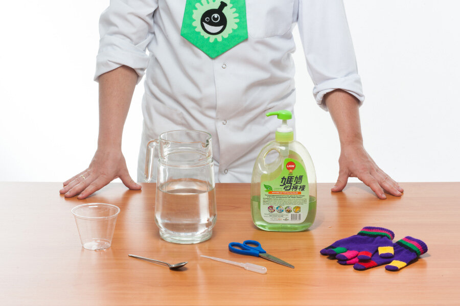 - приготовим мыльный раствор, наполовину наполним чашку теплой водой и добавим в нее 50 мл. средства для мытья посуды – мыльный раствор готов!
