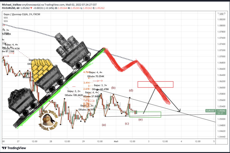Всем привет! Сегодня бы хотелось побольше уделить время валютной паре EURUSD. С фундаментальной части мы наблюдаем долгое падение,а началось все с цены 1.126. В тот момент, если помните, 24 февраля были неимоверные Гэпы в 100 пунктов и на валютах, и на сырье WTIUSD USDRUB сходили с ума, превосходя отметки в 130 . Евро тоже не осталось в стороне, после открытия в разницу в 110 пунктов, цена на новостном фоне не смогла его закрыть, и спускалась без коррекций до 1.05 (с моим опытом в торговле около 6-ти лет, я увидел такую ситуацию впервые) . Если обратить внимание на новостной фон, все основные валюты, которые и составляют цену ( EURUSD GBPUSD NZDUSD USDCHF USDCAD USDJPY ) претерпевают небывалый рост доллара, но не все так просто. Все данные страны имеют рекордную инфляцию в течение 20-ти лет. Данный факт является противоположной стороной роста, ведь все цены поднимаются и поднимаются. Также, растут и цены на уголь, нефть, газ (на фоне " отказа" стран ЕС от российских поставщиков)