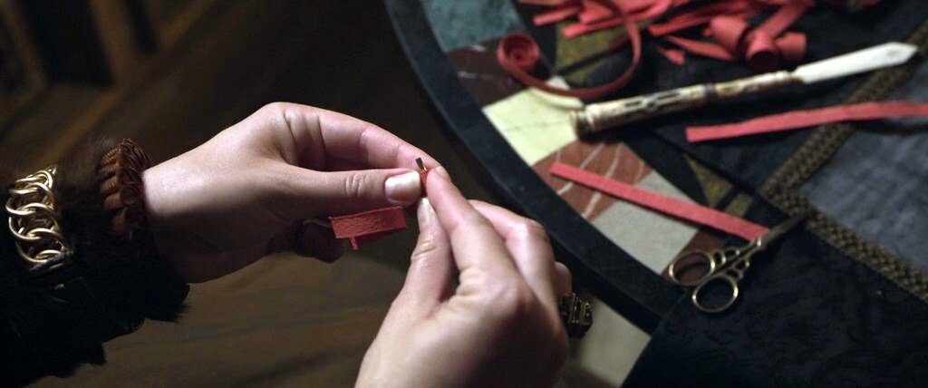 Никогда не перестану удивляться словно в первый раз чудесным выхлопам локализаторов. Казалось бы, название фильма конкретнее некуда — Мария, королева Шотландии. А вот и нет, пусть будут Две королевы 😆 Интереснейшая эпоха, красивые виды, история двух правительниц — Марии Стюарт, королевы Шотландии, и Елизаветы Тюдор, королевы Англии — неизбежно должны были обеспечить картине успех. Но что-то пошло не так. И вместо исторической драмы на экране унылая сказка со слезами, предательством близких, страданиями и поисками любви. Даже в теме рукоделия решили проявить оригинальность, заменив традиционное для того времени вышивание, а уж то, что Мария Стюарт вышивала много и разнообразно — факт исторический, на бумажный квиллинг. Квиллинг, безусловно, в кадре выглядит весьма кинематографично, он, увы, никакого отношения к елизаветинской эпохе не имеет. Английский двор пристально следит за вернувшейся в Шотландию молодой королевой и опасается чрезмерного усиления государства за счет союза с сильно