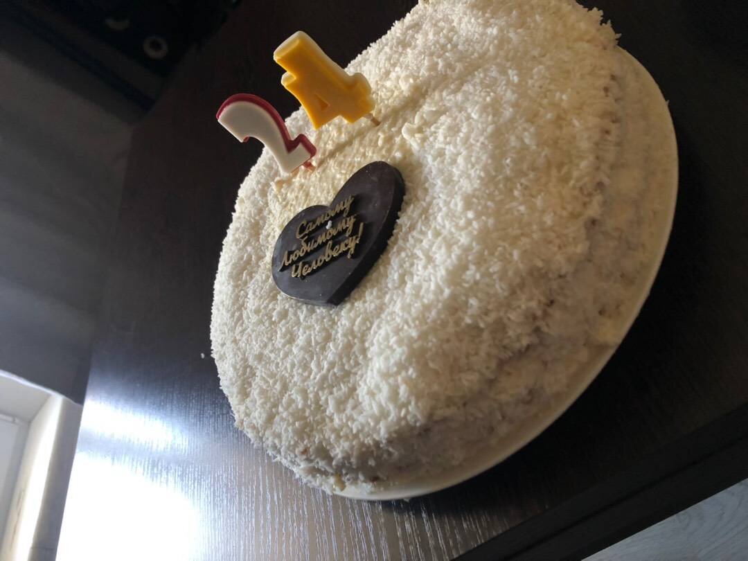 Бисквитный торт готовила в первый раз, получилось супер! Ингредиенты: Тесто, яиц, сахара, соли, ванильный сахар, разрыхлитель, мука, Конфи ананасовое, ананас консервированный, сок от ананаса , агар-агар, Крем, творожного сыра, сгущёнки, кокосовая стружка Способ приготовления: Взбить 5 яиц 3 минуты, до пены. Добавить 1 стакан сахара, щепотку соли. Взбивать ещё 2 минуты до пышной пены. Смешать сухие ингредиенты (разрыхлитель, ванилин, стакан муки). Добавлять в яичную смесь постепенно через сито. Размешать до однородной массы. Форму для выпечки смазать сливочным маслом. Вылить смесь. Выпекать 35-40 минут при температуре 180 градусов. Если будет гореть верх, то можно накрыть фольгой. Пока выпекается корж готовим конфи. Выливаем в кастрюлю банку ананаса с соком. Доводим до кипения, добавляем агаг-агар. Выливаем в форму меньшую деаметром торта, дно формы застелить пленкой. Застывает масса при комнатной температуре, 15-20 минут. Делаем крем. В чашу выкладываем творожный сыр. Добавляем банку с